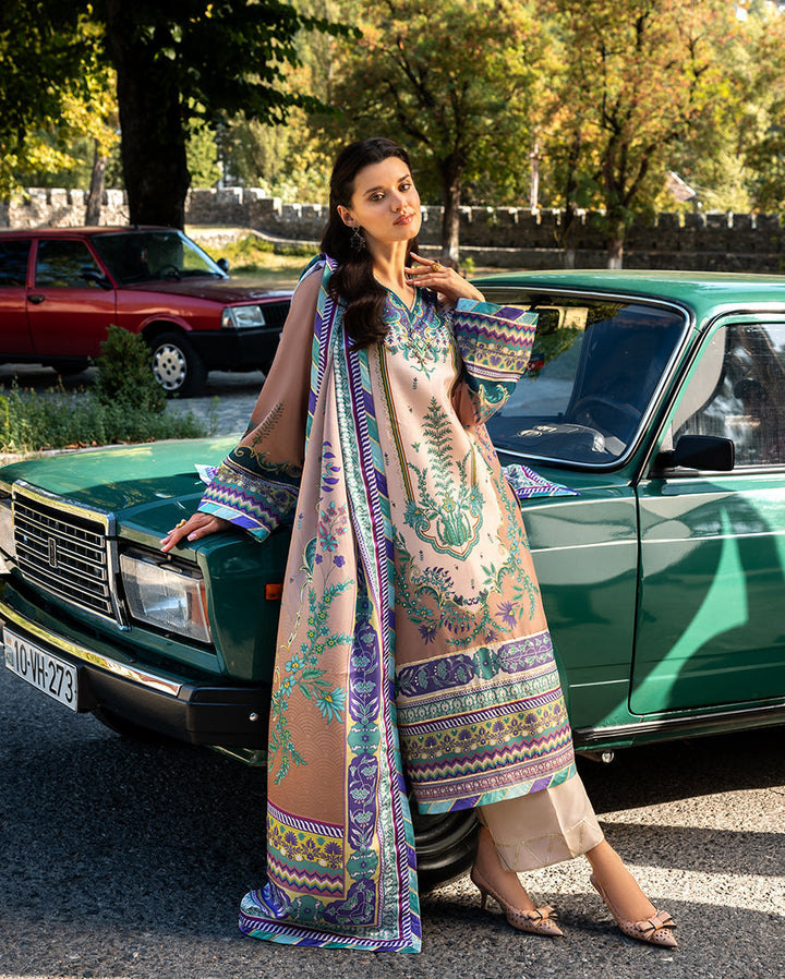 Description: Shirt:• Printed embellished raw silk front• Printed raw silk back & sleeves• Hand-embellished neckline buttons Dupatta:• Printed silk dupatta Trousers:• Dyed raw silk trousers Finishing:• Golden samosa lace for finishing•...