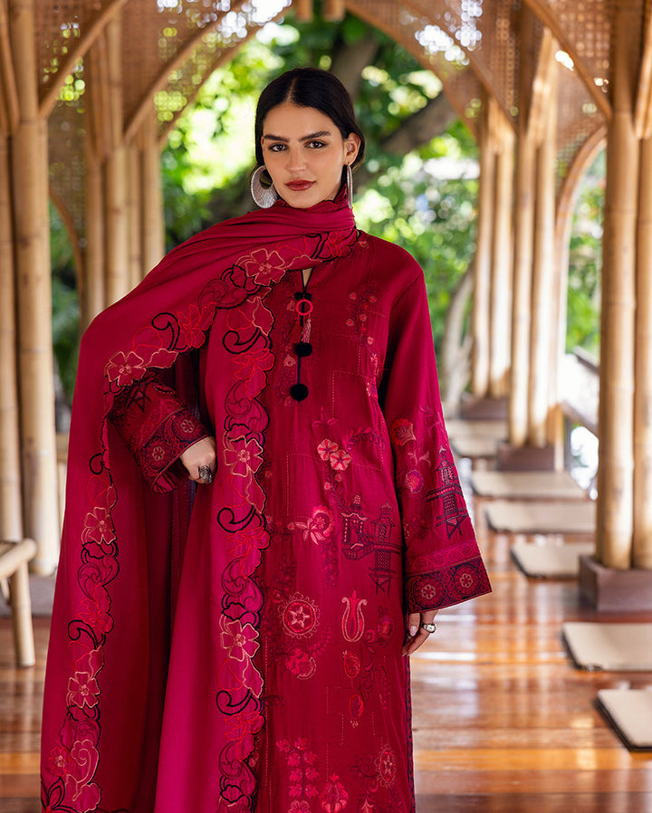 Description: Shirt: • Embroidered karandi front• Embroidered karandi back• Embroidered karandi sleeves• Embroidered front & back daman border (silk)• Embroidered front & back sleeves lace (silk)• Embroidered sleeves border (silk)• Embroidered...