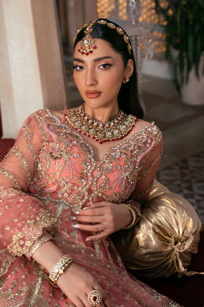 Description: Embroidered net with handmade embellishment for front yoke.Embroidered net back yoke.Embroidered net front & back panels.Embroidered net with handmade embellishment for sleeves.Embroidered net dupatta.Embroidered organza border for front & back.Embroidered organza border for sleeves.