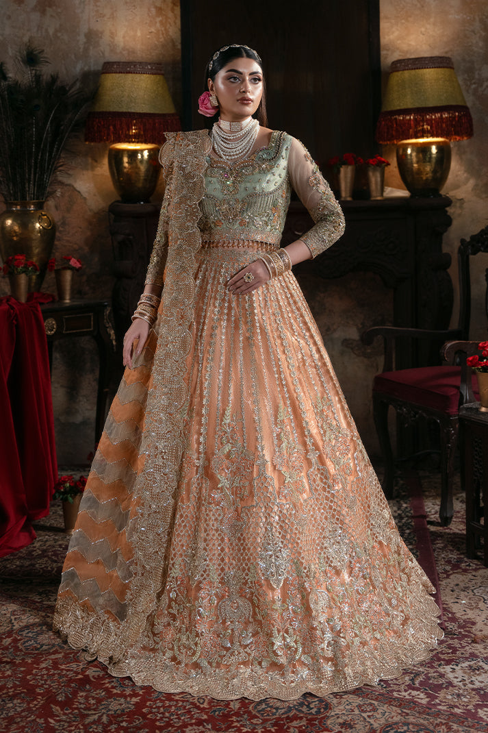 Description: Embroidered net with handmade embellishment for front yoke. Embroidered net back yoke. Embroidered net front & back panels. Embroidered net with handmade embellishment for sleeves. Embroidered net & organza dupatta....
