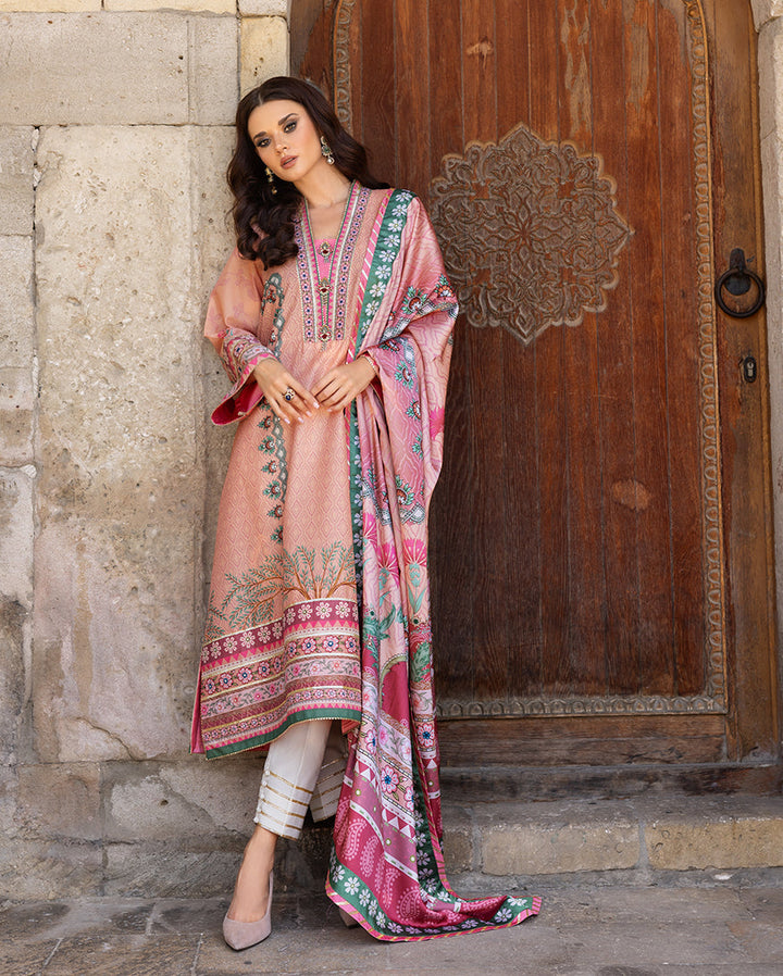 Description: Shirt:• Printed embellished raw silk front• Printed raw silk back & sleeves• Hand-embellished neckline buttons Dupatta:• Printed silk dupatta Trousers:• Dyed raw silk trousers Finishing:• Golden samosa lace for finishing•...